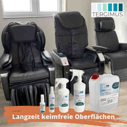 "Мы знаем от наших коммерческих клиентов, что дезинфекция поверхностей в общественных местах, таких как больницы и социальные учреждения, требует много времени и затрат. Это также является проблемой в спортивных залах, приемных или островках релаксации в компаниях", - знает Родеске. "Дезинфекция после каждого использования отнимает много времени и не подходит для ежедневного использования. Этот рынок полностью рухнул бы для нас без подходящих средств гигиены", - уверен он. В поисках подходящего продукта для поверхностей массажных кресел он наткнулся на компанию TERGIMUS назван в честь латинского термина tergere = чистить. Обе компании заботятся о здоровье и устойчивом развитии, поэтому сотрудничество было очевидным. Медицинское моющее средство PUREMANENT производится на водной основе, также планируется разливать его в бутылки из морского пластика.