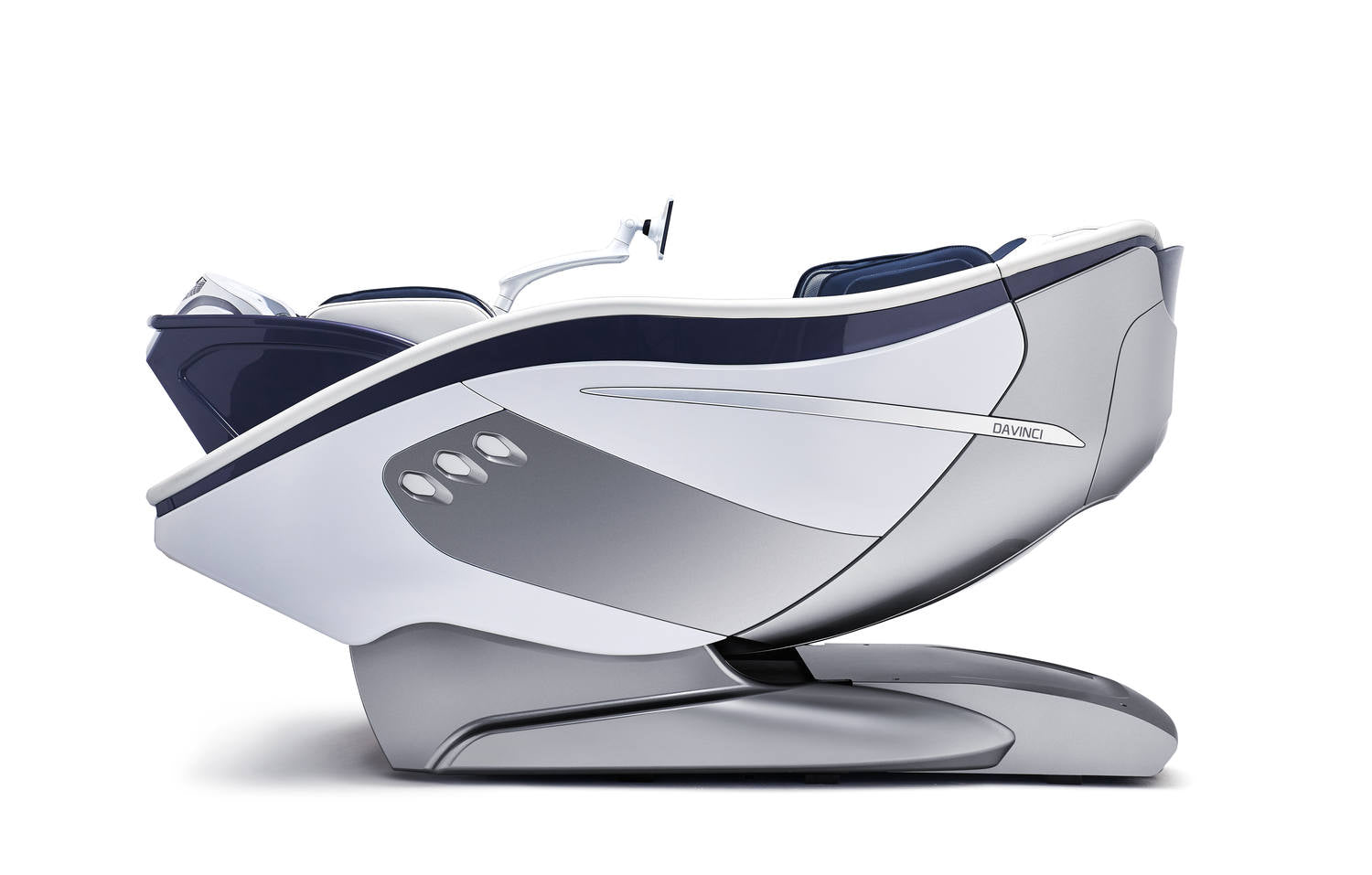 "DaVinci был сложным проектом. Он позволил нам в полной мере проявить наш опыт в разработке технологий с последовательностью и балансом. Компактный, знаковый, рациональный и отличительный, DaVinci обладает четким эффектом "кокона", обволакивающей и защитной оболочки с элегантной эргономикой, чтобы расслабиться и, прежде всего, воспользоваться многочисленными функциями, которыми оснащен DaVinci. Цветовая палитра, использованная для DaVinci, отсылает к миру медицины: синий - цвет гигиены и здоровья, белый - идеальный цвет для медицинского и технического сектора. Серые металлические компоненты отсылают к нашим многочисленным исследовательским прототипам автомобилей. В целом, в дизайне явно прослеживается отсылка к автомобильному миру, узнаваемая по таким элементам, как боковые световые элементы, указывающие на то, какой тип массажа активирован в данный момент, или крутилка прямо под подставкой для ног".