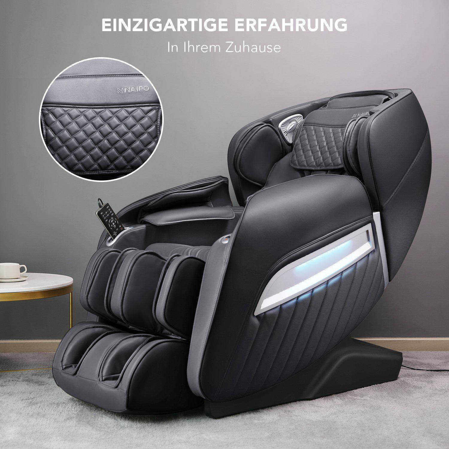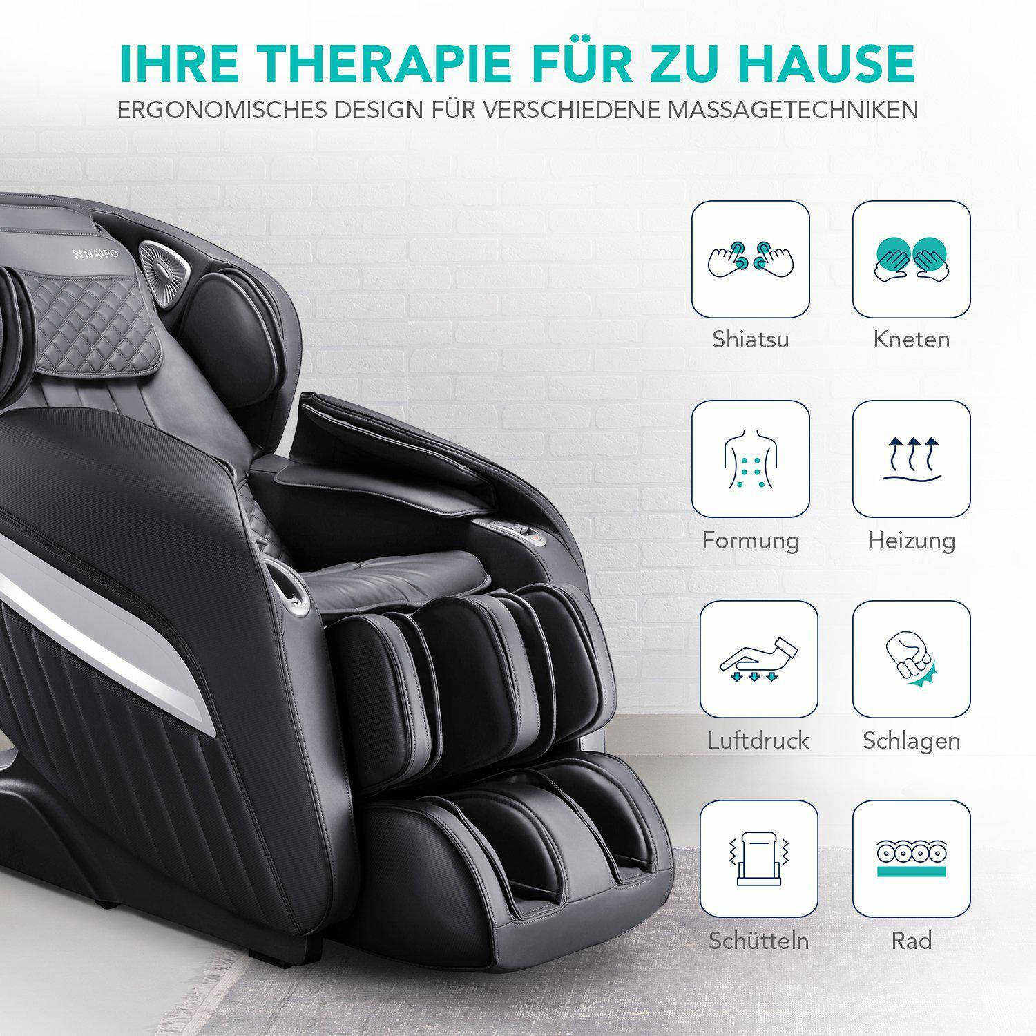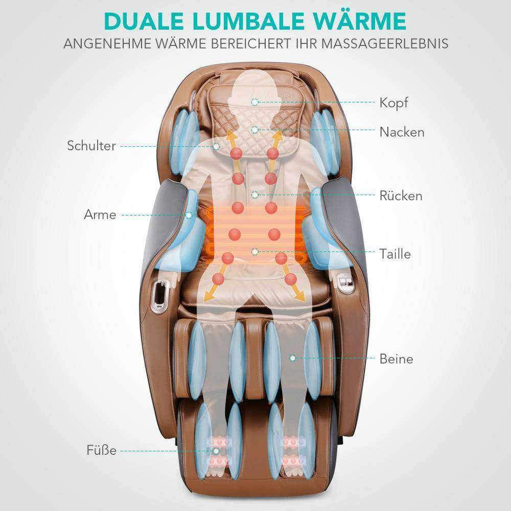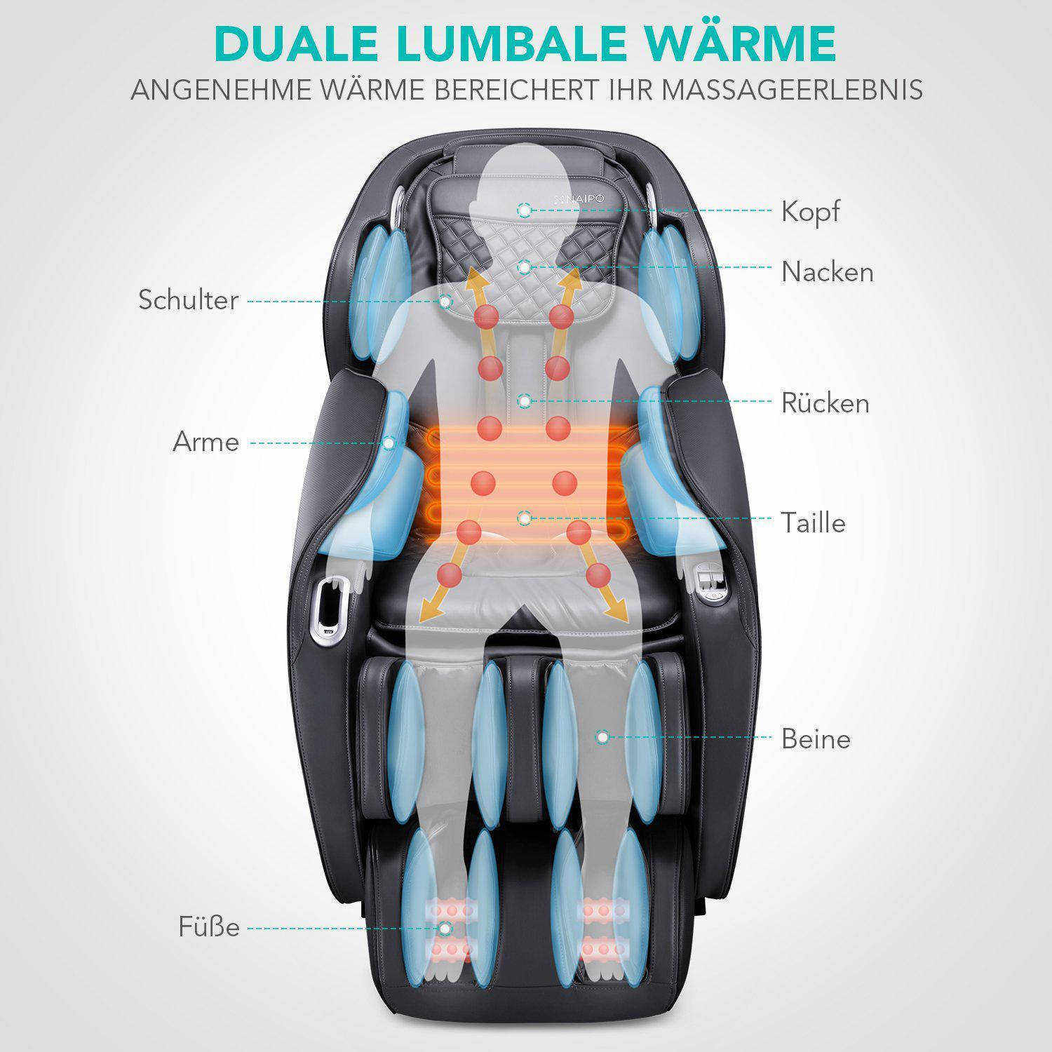 Несмотря на привлекательный внешний вид, есть веская причина, по которой не стоит сводить ваше новое массажное чудо только к его внешнему виду: С помощью интуитивно понятного пульта дистанционного управления вы можете наслаждаться оздоровительной релаксационной терапией с головы до ног одним нажатием кнопки. Широкое разнообразие положений плеч, уровней скорости, движений роликов и интенсивности давления воздуха гарантирует получение массажа в полном соответствии с вашими предпочтениями. Специально созданная изюминка - два индивидуально регулируемых положения "Zero Gravity": При оптимальной разгрузке позвоночника вы сможете испытать уникальное ощущение невесомости, наслаждаясь комфортным сидением "новичка". Также заслуживают похвалы высококачественные воздушные подушки и массажные ролики в области подошвы стопы, которые расслабляют мышцы и способствуют здоровой подвижности. Между тем, мощная функция подогрева окутывает область поясницы уютным теплом и делает "Einsteiger" вашим новым местом хорошего самочувствия.